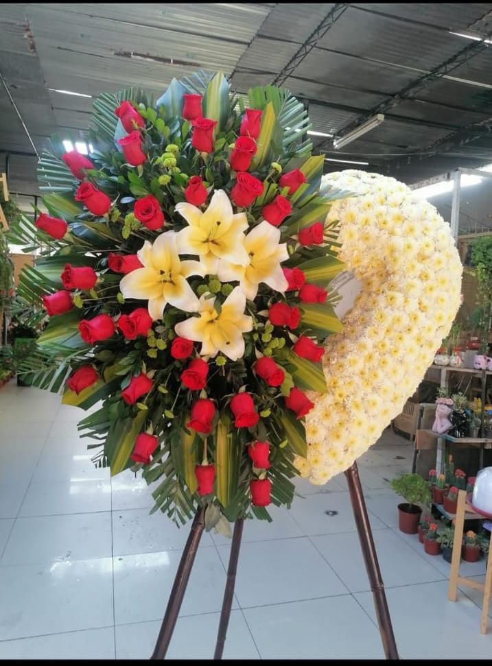 Arreglo en forma de corazón hecho a base de rosas, lirios y follaje