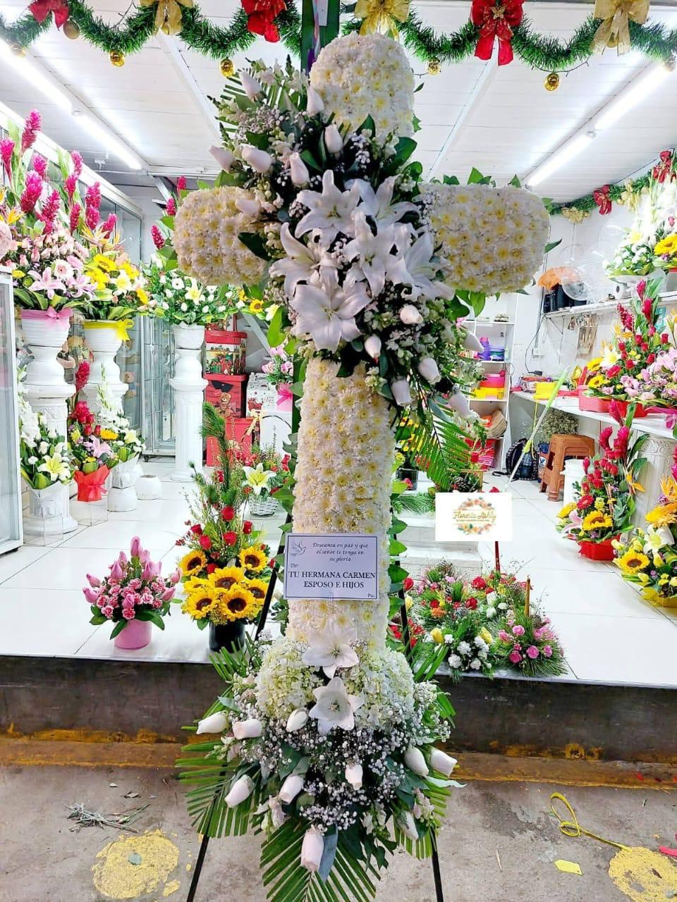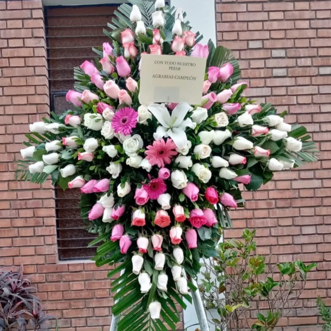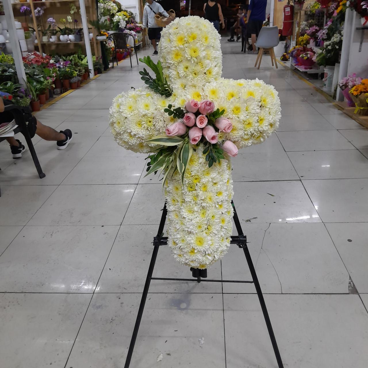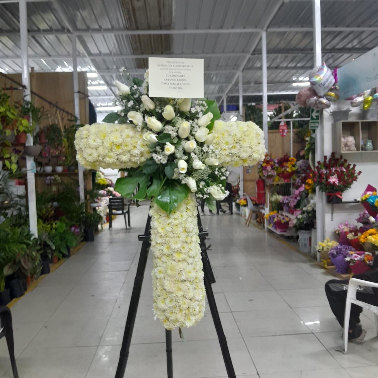 Cruz, para las condolencias . Hecha con pompon blanco, rosas y lirios . su altura es de 1.60m aprox